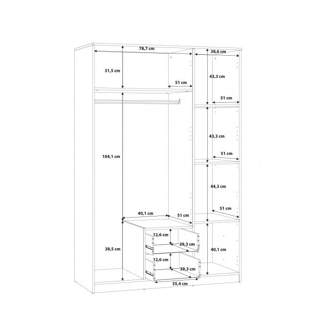 Maksymalne obciążenie: szuflady do 5 kg, półki do 5 kg, drążek do 15 kg,