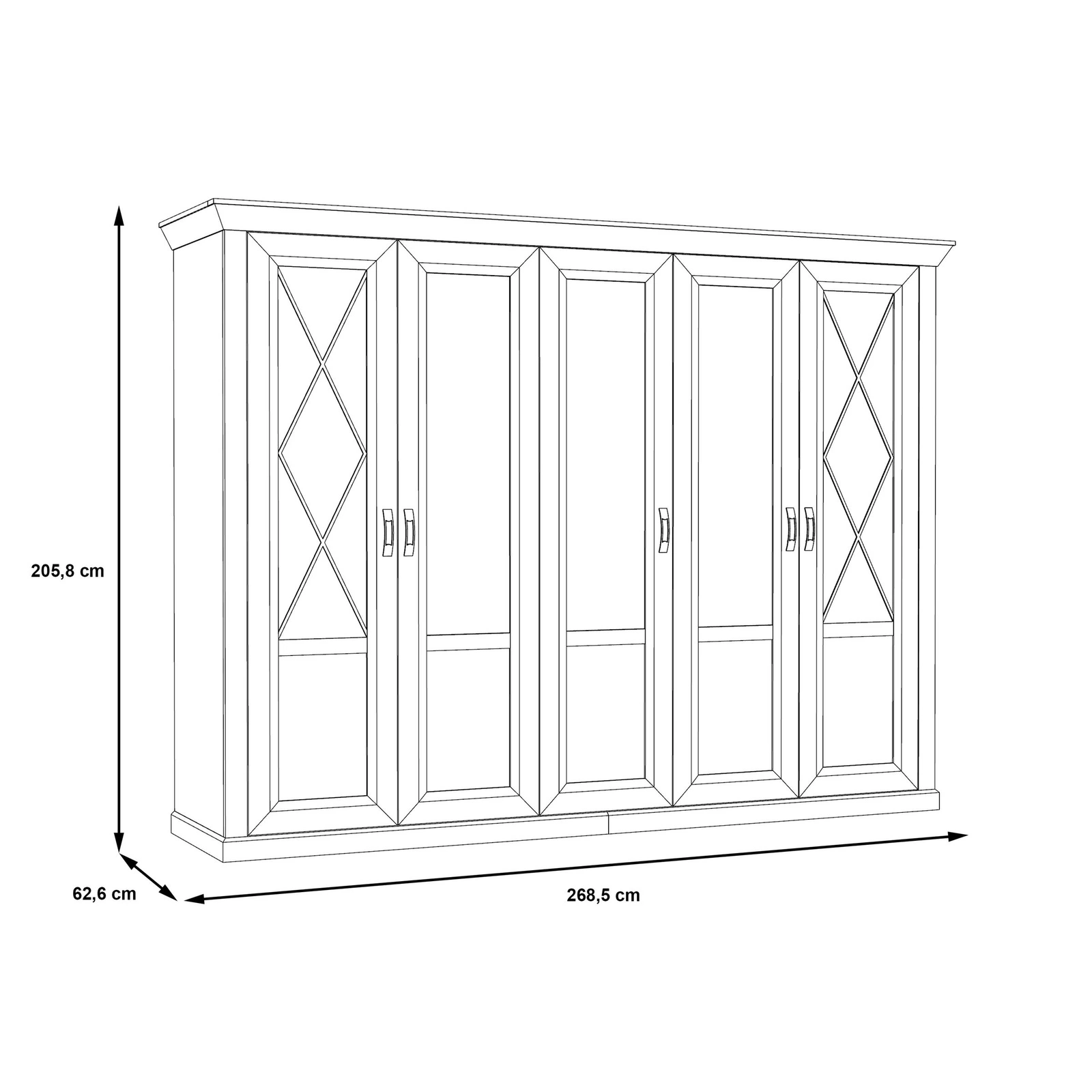 Lustrzane fronty tej szafy nie tylko powiększają optycznie wnętrze, ale również dodają mu harmonii i jasności. Ozdobne szprosy i ramkowe wykończenia nadają meblowi klasyczny wygląd inspirowany epokowymi aranżacjami. Jeśli interesują Cię szafy do sypialni z lustrem, model Kashmir spełni Twoje oczekiwania zarówno pod względem estetyki, jak i praktyczności.
