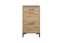 Wygodę użytkowania zapewniają prowadnice z funkcją cichego domyku w szufladach, a konstrukcja z trwałej płyty laminowanej odpornej na zarysowania i wilgoć, wzmocniona obrzeżem ABS, gwarantuje wytrzymałość nawet przy intensywnym użyciu. Jasny dekor dębu nadaje komodzie elegancki, naturalny wygląd.