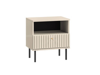 Mebel ma 70 cm szerokości, 54 cm wysokości i 34 cm głębokości, dzięki czemu zmieści się nawet w wąskim przedpokoju, oferując przy tym stabilną i wygodną przestrzeń do siedzenia. Tapicerowane siedzisko z przeszyciami nie tylko podnosi komfort użytkowania, ale także wprowadza przytulny i elegancki akcent. Kontrastujące czarne uchwyty i metalowa podstawa nadają całości nowoczesnego, loftowego charakteru.