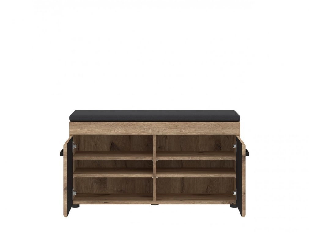 Kompaktowe wymiary pozwalają na umieszczenie szafki nawet w niewielkich przestrzeniach zapewniając dużą pojemność i organizację obuwia. Dwudrzwiowa konstrukcja skrywa pojemne półki, które pomieszczą zarówno codzienne jak i sezonowe buty.