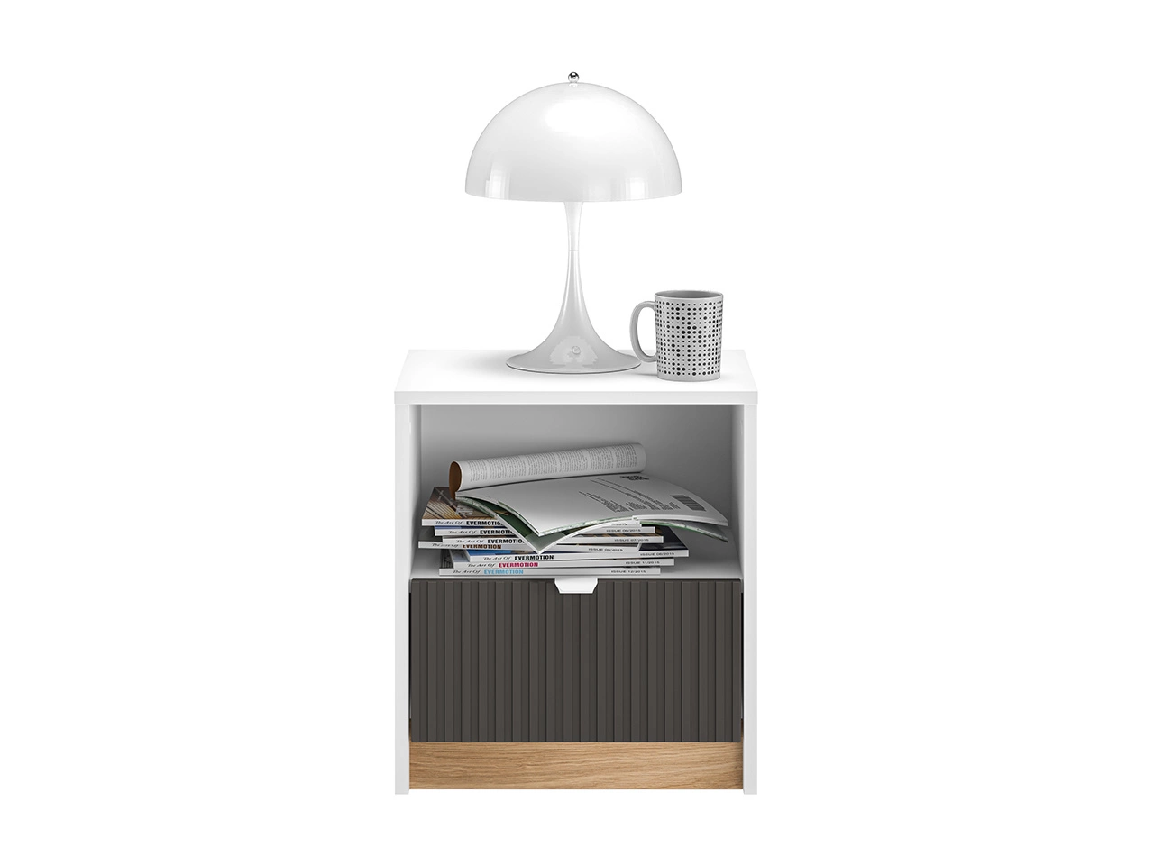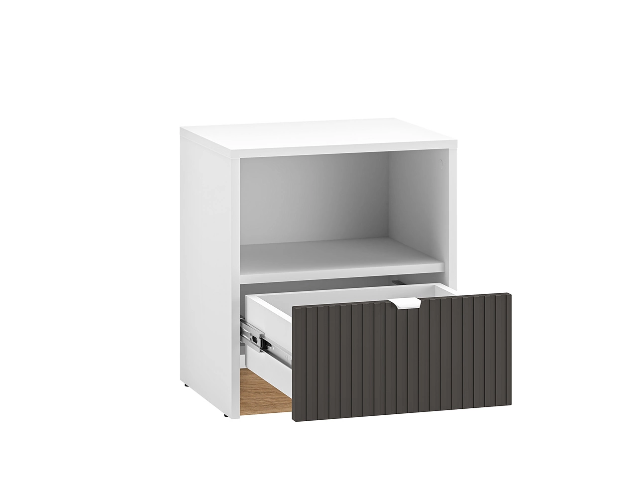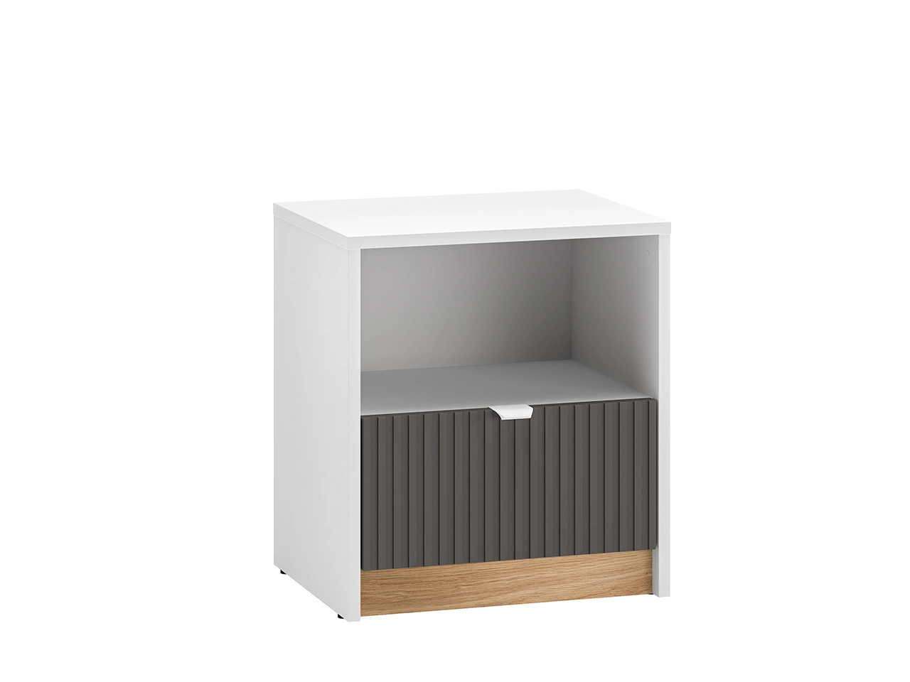 - Szafka nocna Torino 09 to nowoczesny mebel w kolorze Biały + Grafit Mat z dekoracyjnym Dębem Castello, wyposażony w pełny wysuw szuflady. Wyprodukowana z trwałej płyty laminowanej i obrzeżem ABS, łączy stylowy wygląd z wygodą i trwałością.
