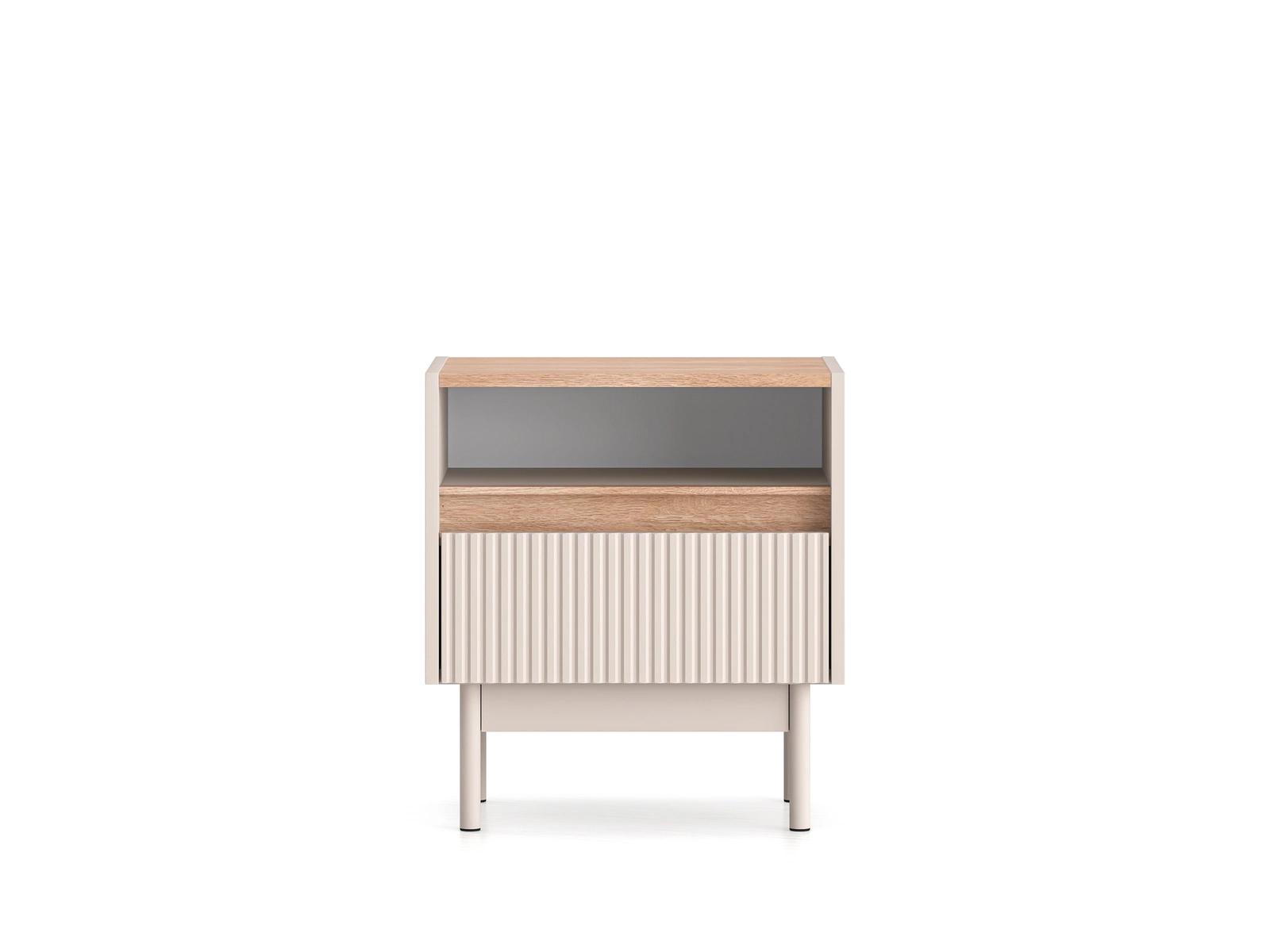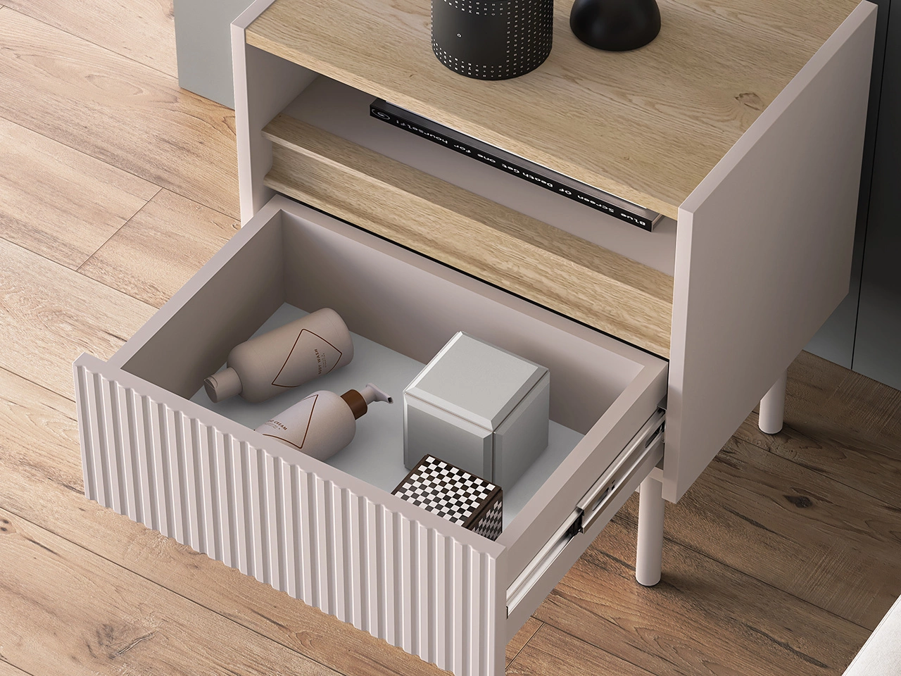 Górna część mebla to praktyczny blat – idealny na lampkę, szklankę wody czy okulary. Poniżej znajdziesz otwartą wnękę, w której możesz wygodnie przechowywać książki, czasopisma czy notatnik. Dodatkowo, dolna szuflada z funkcją pełnego wysuwu pomieści drobiazgi, które chcesz mieć pod ręką, ale ukryte – np. ładowarkę, kosmetyki czy leki.