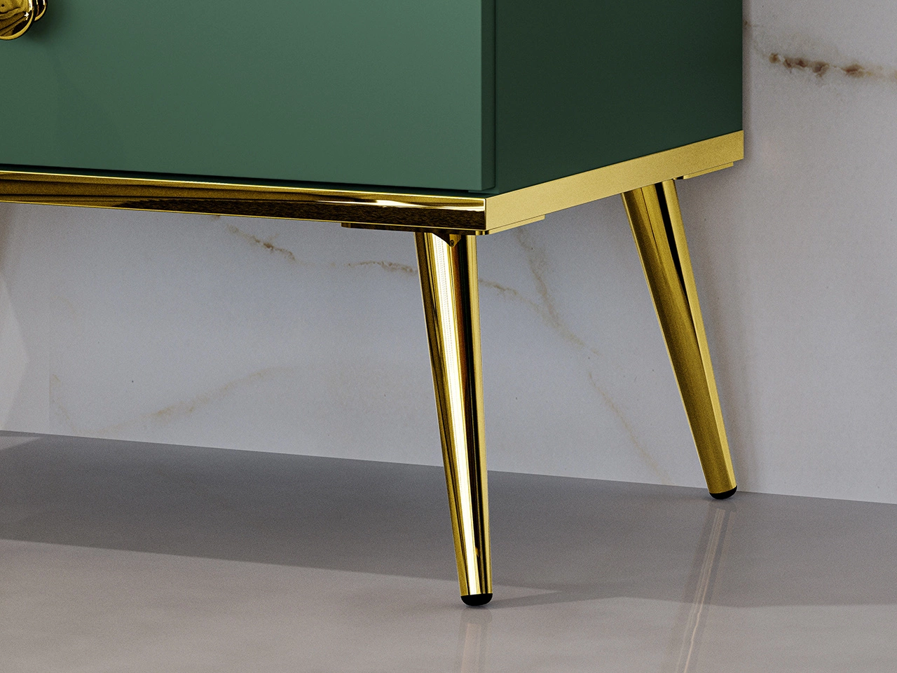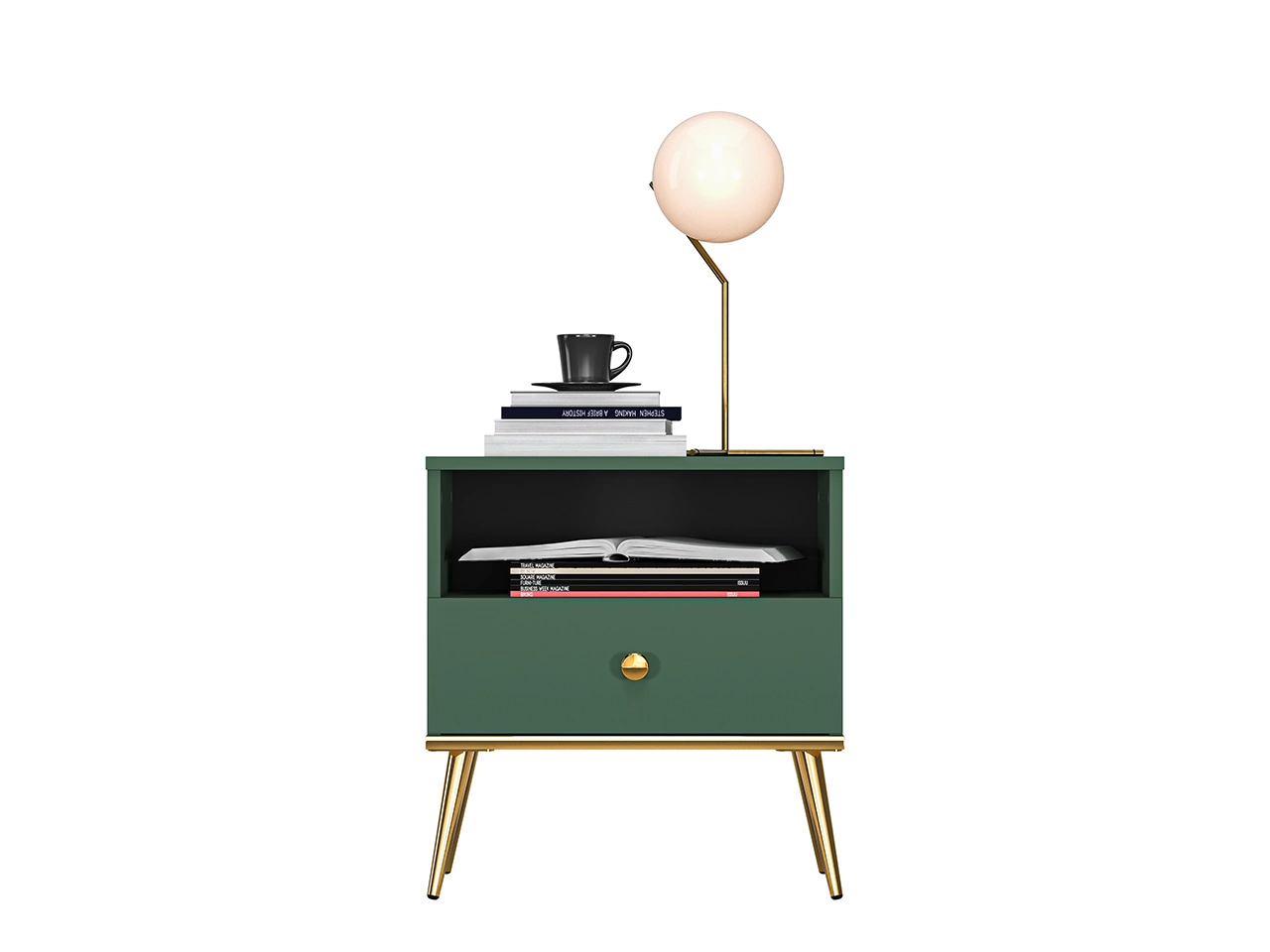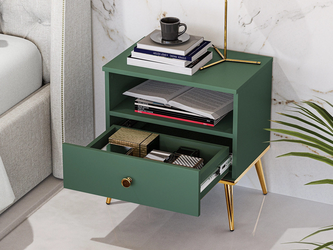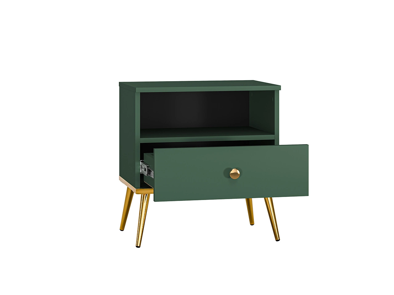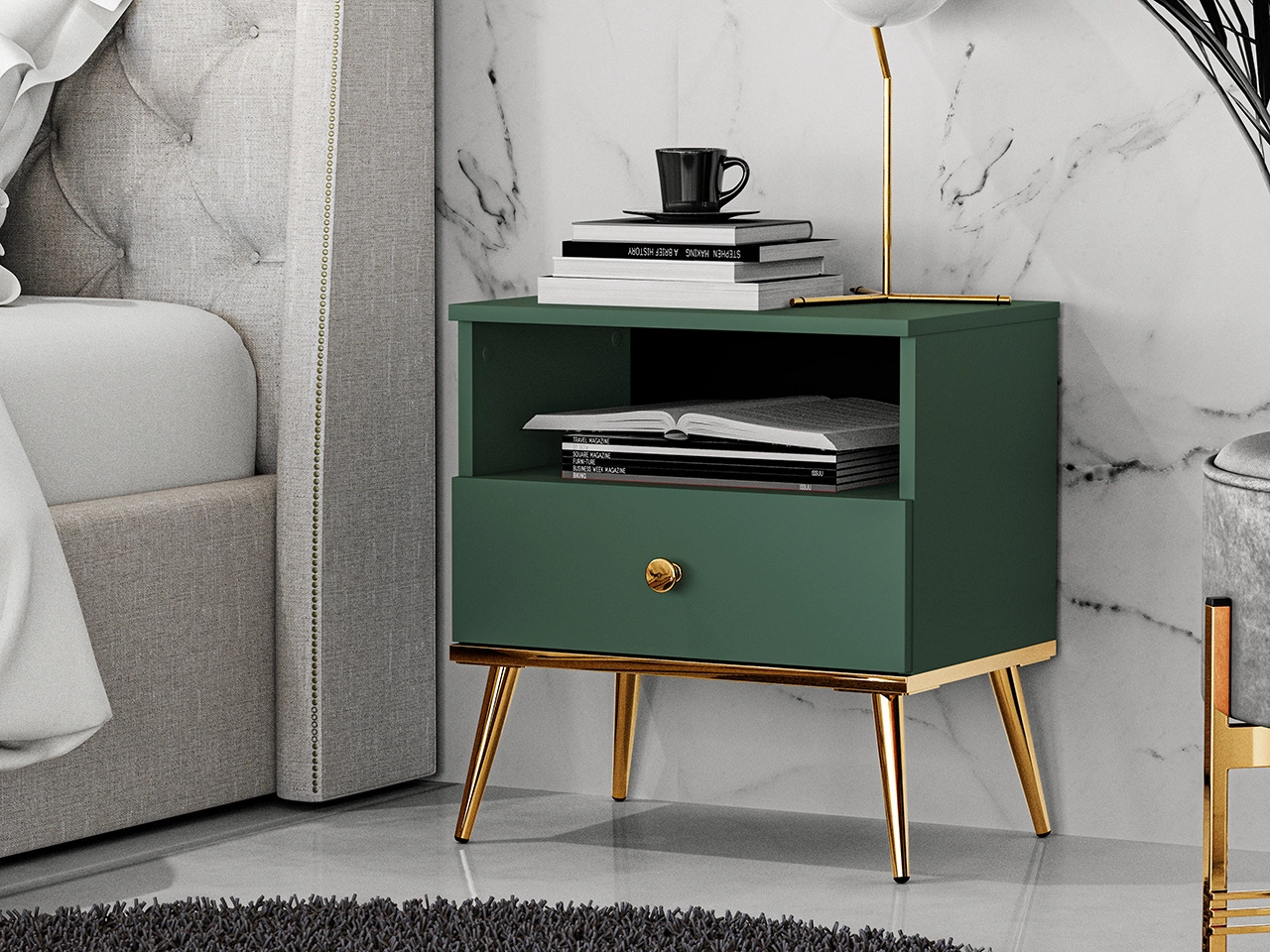 • Szafka nocna FOREST 06 to elegancki mebel w kolorze Labrador (ciemnozielonym), wyposażony w metalowe nóżki w złotym wykończeniu. Dzięki kompaktowym wymiarom i nowoczesnemu designowi, doskonale pasuje do współczesnych sypialni, oferując funkcjonalne miejsc