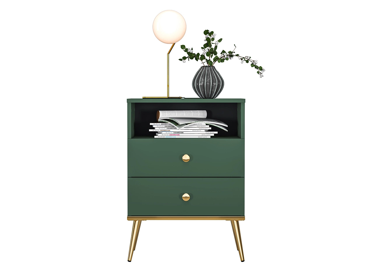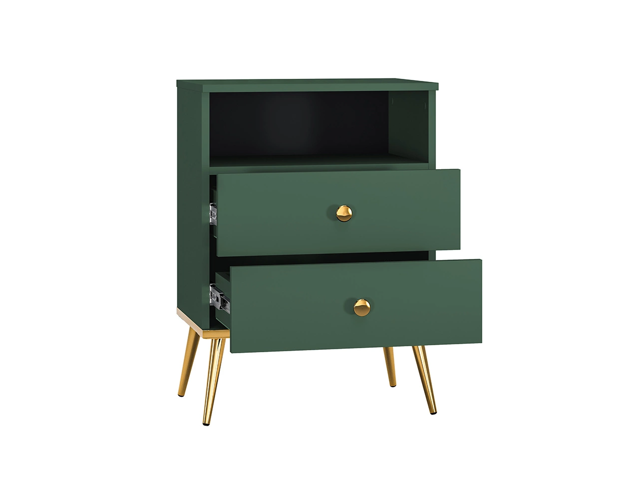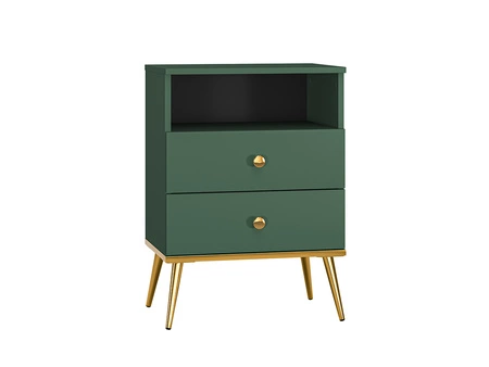 - Szafka nocna FOREST 10 to elegancki mebel w kolorze Labrador (zielonym), wyposażony w dwie praktyczne szuflady i metalowe nóżki w złotym wykończeniu. Dzięki nowoczesnemu designowi i kompaktowym wymiarom, idealnie pasuje do współczesnych sypialni, oferując
