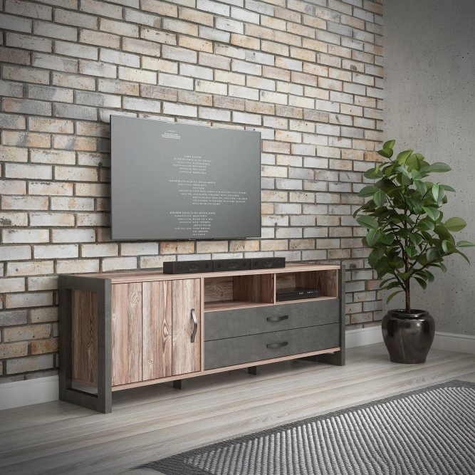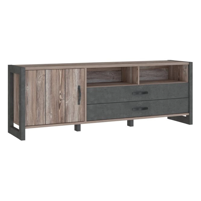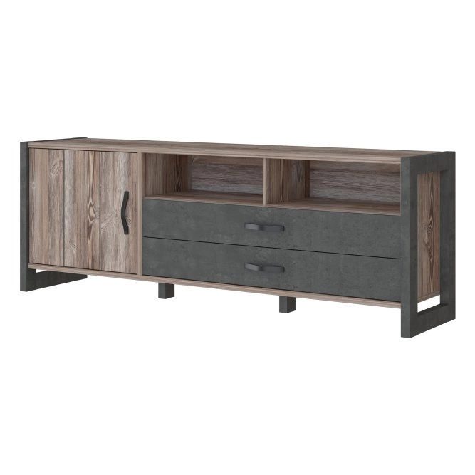 - Nowoczesna szafka RTV z kolekcji Note. Szerokość 190 cm zapewnia dużo miejsca na telewizor i sprzęt, a szuflady i półki ułatwiają przechowywanie. Połączenie betonu i sosny picea dodaje wnętrzu loftowego stylu.