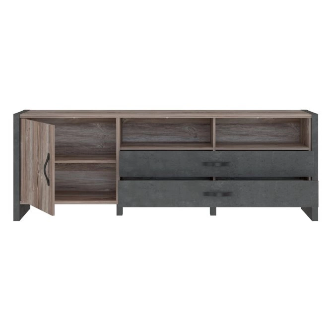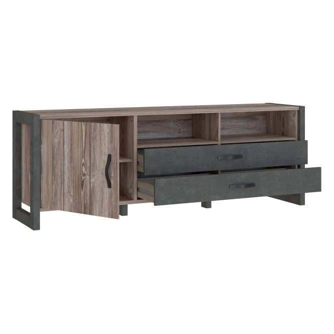 Szafka RTV FORTE NOTE zachwyca połączeniem ciemnoszarego betonu z dekorem jasnej sosny, co nadaje jej surowy, industrialny charakter z ciepłym akcentem. Całości dopełniają czarne uchwyty, które podkreślają nowoczesną linię mebla.