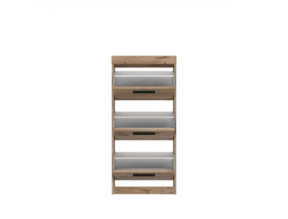 Szafka na buty Grano to elegancki i funkcjonalny mebel do przedpokoju który pozwala na wygodne przechowywanie obuwia i utrzymanie porządku w pomieszczeniu. Dzięki nowoczesnemu designowi i kompaktowym wymiarom doskonale sprawdzi się w różnych aranżacjach wnętrz. Odcień dąb Viking nadaje jej naturalnego charakteru a czarne uchwyty podkreślają loftowy i minimalistyczny styl.