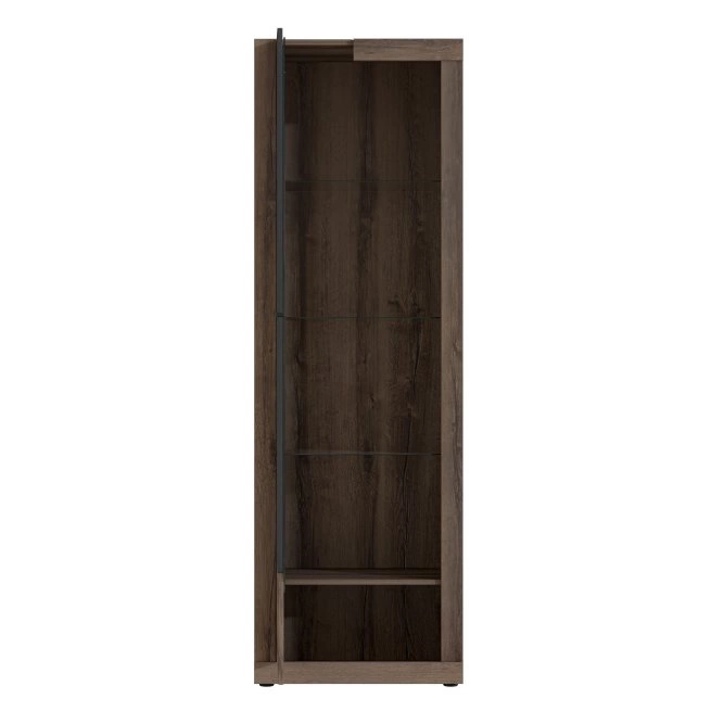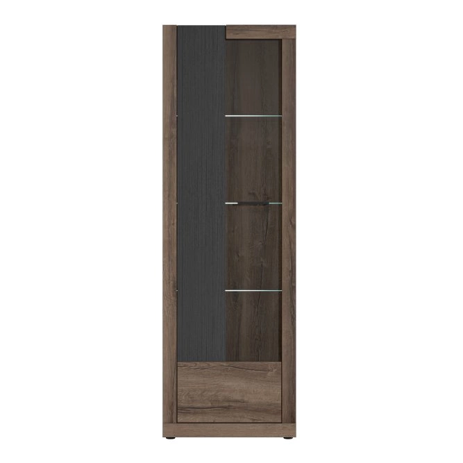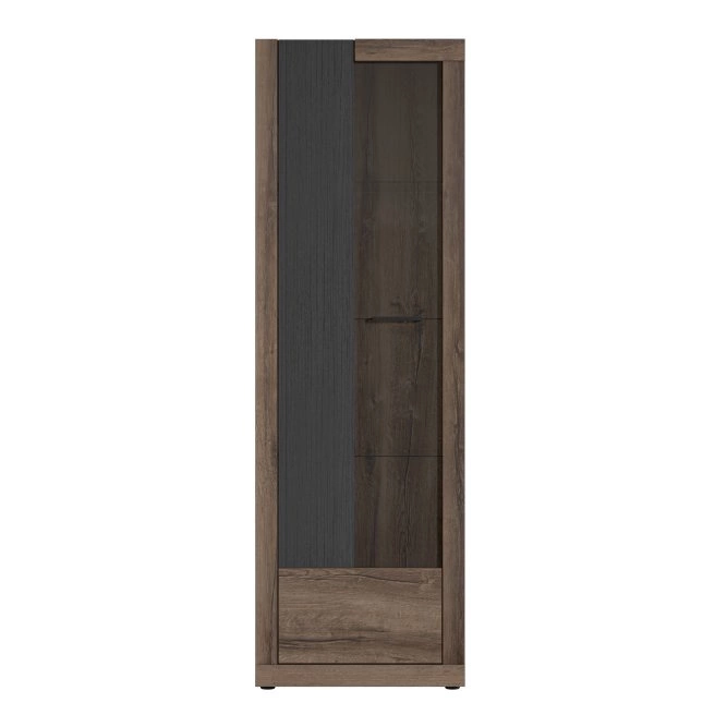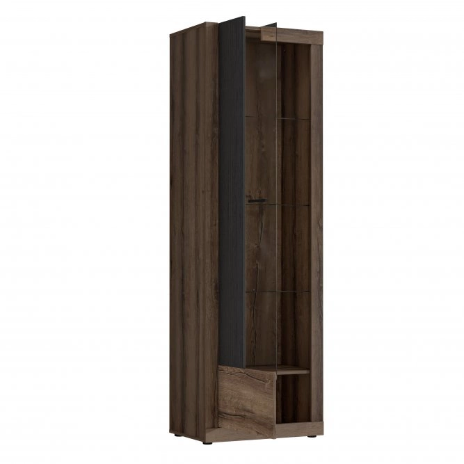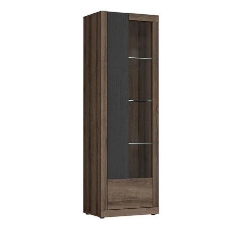 • Witryna z kolekcji TRASS to idealne rozwiązanie do mniejszych przestrzeni. Stylowe połączenie dekoru Dąb Szlachetny z akcentem w kolorze Dąb Czarny dodaje nowoczesnego charakteru, a przeszklenie pozwala na efektowną ekspozycję dekoracji,