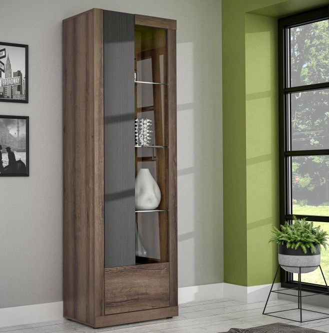 Wysoka witryna z kolekcji Trass to mebel z charakterem który odmieni Twoje wnętrze