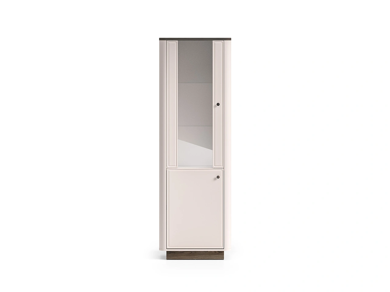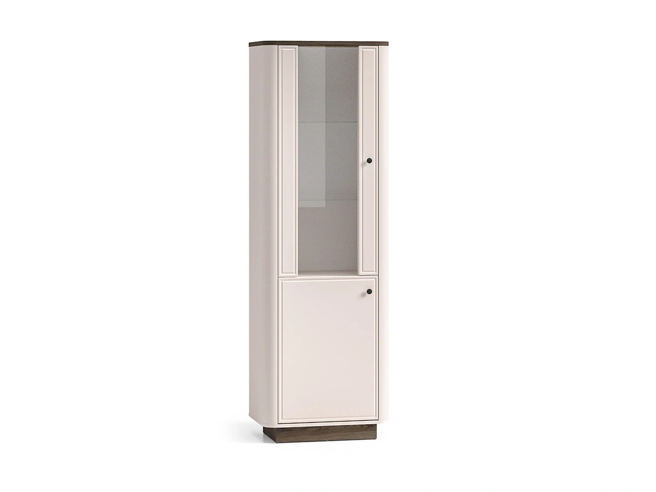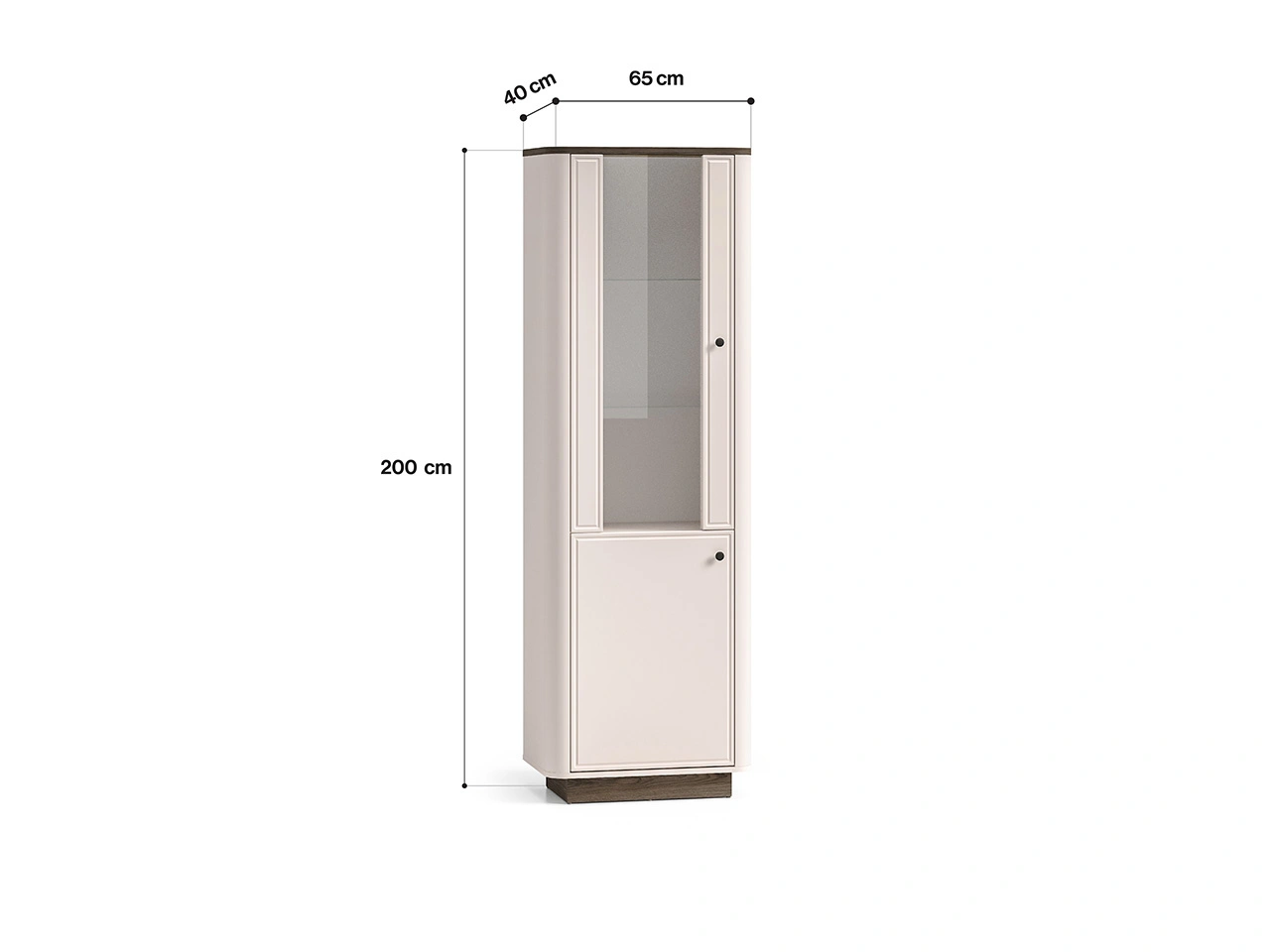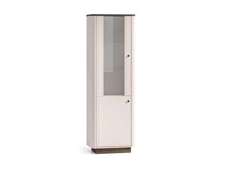 - Witryna Vilavio 01 to elegancki mebel z przeszkloną górną częścią, szklaną półką i zamykaną dolną strefą, idealny do ekspozycji zastawy i przechowywania tekstyliów. Stylowe wykończenie w kolorze kaszmirowym z dekorem Dąb Windmill Dark.