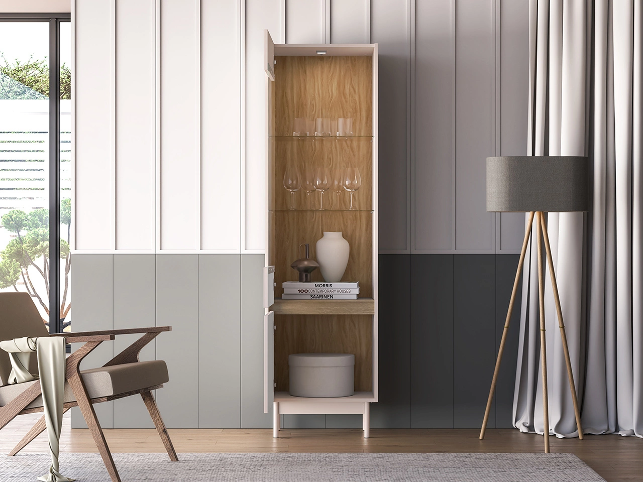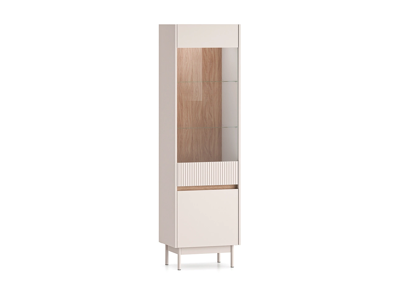 Mebel wyróżnia się modnym zestawieniem kolorystycznym – kaszmirowa bryła z detalami w dekorze Dąb Cremona nadaje wnętrzu ciepła i nowoczesnej elegancji. Subtelne pionowe frezowanie oraz minimalistyczna forma sprawiają, że witryna świetnie odnajdzie się zarówno w stylu skandynawskim, japandi, jak i modern classic.