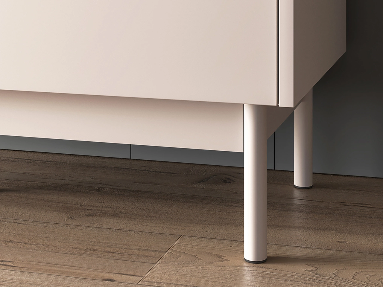 Całość osadzona jest na smukłych, metalowych nóżkach, które nie tylko zapewniają stabilność i trwałość, ale także ułatwiają sprzątanie pod meblem – nawet robotem sprzątającym. Komfort użytkowania podnosi zastosowanie zawiasów z funkcją cichego domykania, dzięki którym drzwiczki zamykają się bezszelestnie i płynnie.