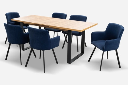 Komplet składa się z drewnianego, rozkładanego stołu w stylu loftowym oraz 6 eleganckich krzeseł Viki tapicerowanych wysokiej jakości tkaniną – razem tworzą harmonijną i stylową całość